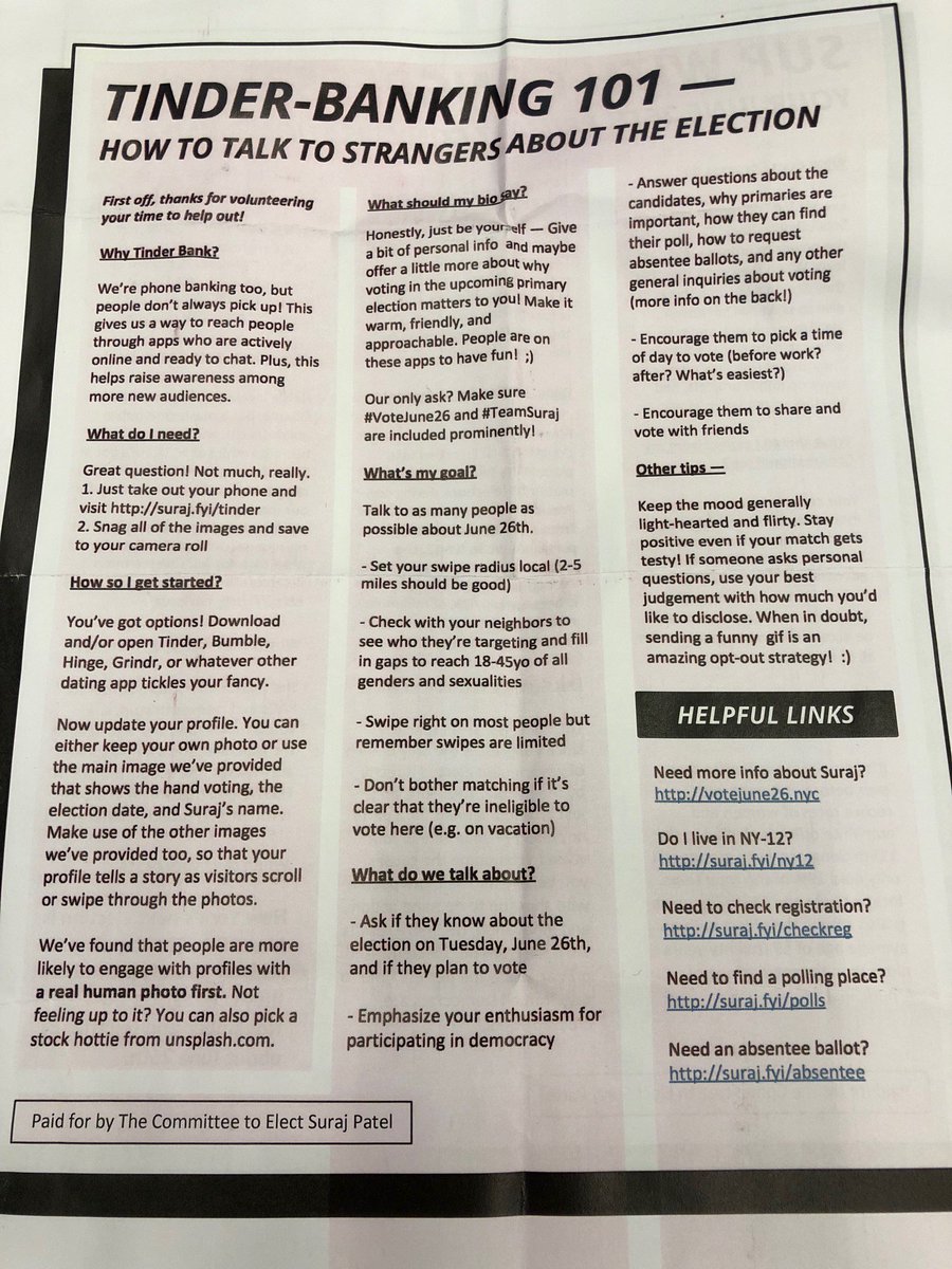“What if Tinder banking works so well that we get 1,000 extra votes? Shouldn’t the party be like: ‘Cool, let’s start doing this,’” Patel told the Times. “I find the lack of creativity in politics appalling.”
